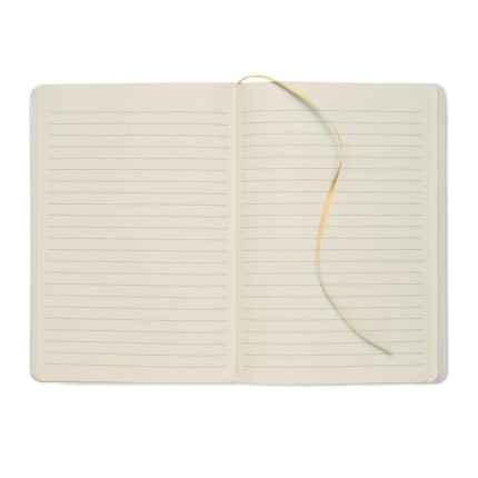 Notebook Α5 με σκληρό ανακυκλωμένο κάλυμμα . Λευκό κάλυμμα. 160 σελίδες ανακυκλωμένου χαρτιού με γραμμές (80 φύλλα). Ελαστικός ιμάντας κλεισίματος, αντιστοίχιση σελιδοδείκτη κορδέλας. Μετά τη χάραξη με λέιζερ αποκαλύπτεται το χρώμα.