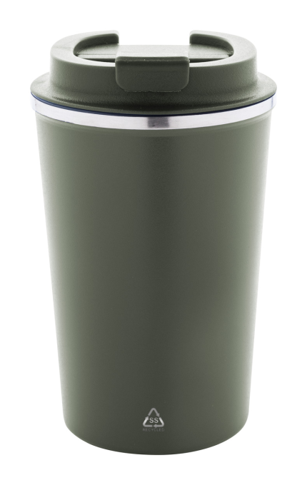 Kούπα από ανακυκλωμένο ανοξείδωτο ατσάλι, με διπλό τοίχωμα και ματ χρώμα χωρητικότητας 600 ml. Περιλαμβάνει καπάκι κουμπώματος, διανομέα που ανοίγει εύκολα και άκαμπτη λαβή για ευκολία. Είναι ιδανικό για το γραφείο, το τραπέζι ή οποιαδήποτε επιφάνεια όπου μπορείτε να απολαύσετε το αγαπημένο σας ποτό. Με λογότυπο Recycled Stainless Steel.