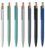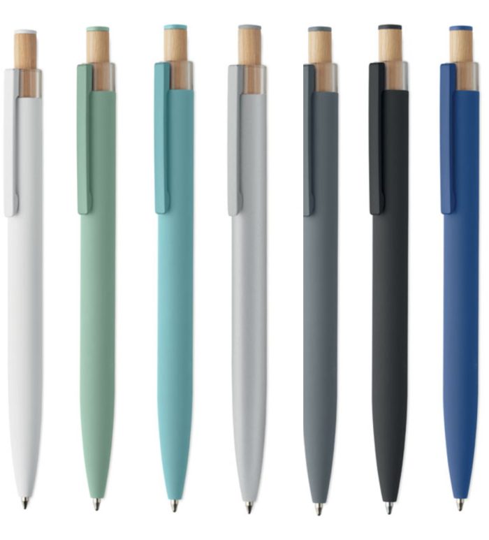 Στυλό από ανακυκλωμένο αλουμίνιο με κουμπί μπαμπού με ασορτί χρωματική λεπτομέρεια και ασορτί μεταλλικό κλιπ.