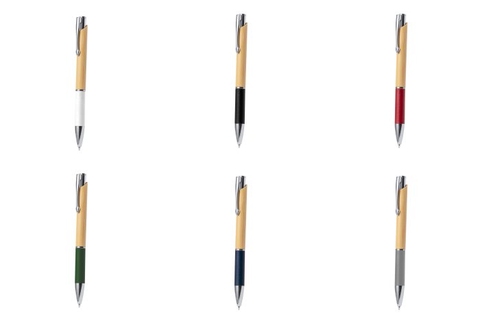 Στυλό με σώμα μπαμπού και λαβή από χαρτόνι ανακυκλωμένης υφής, σε ποικιλία χρωμάτων.