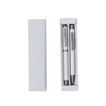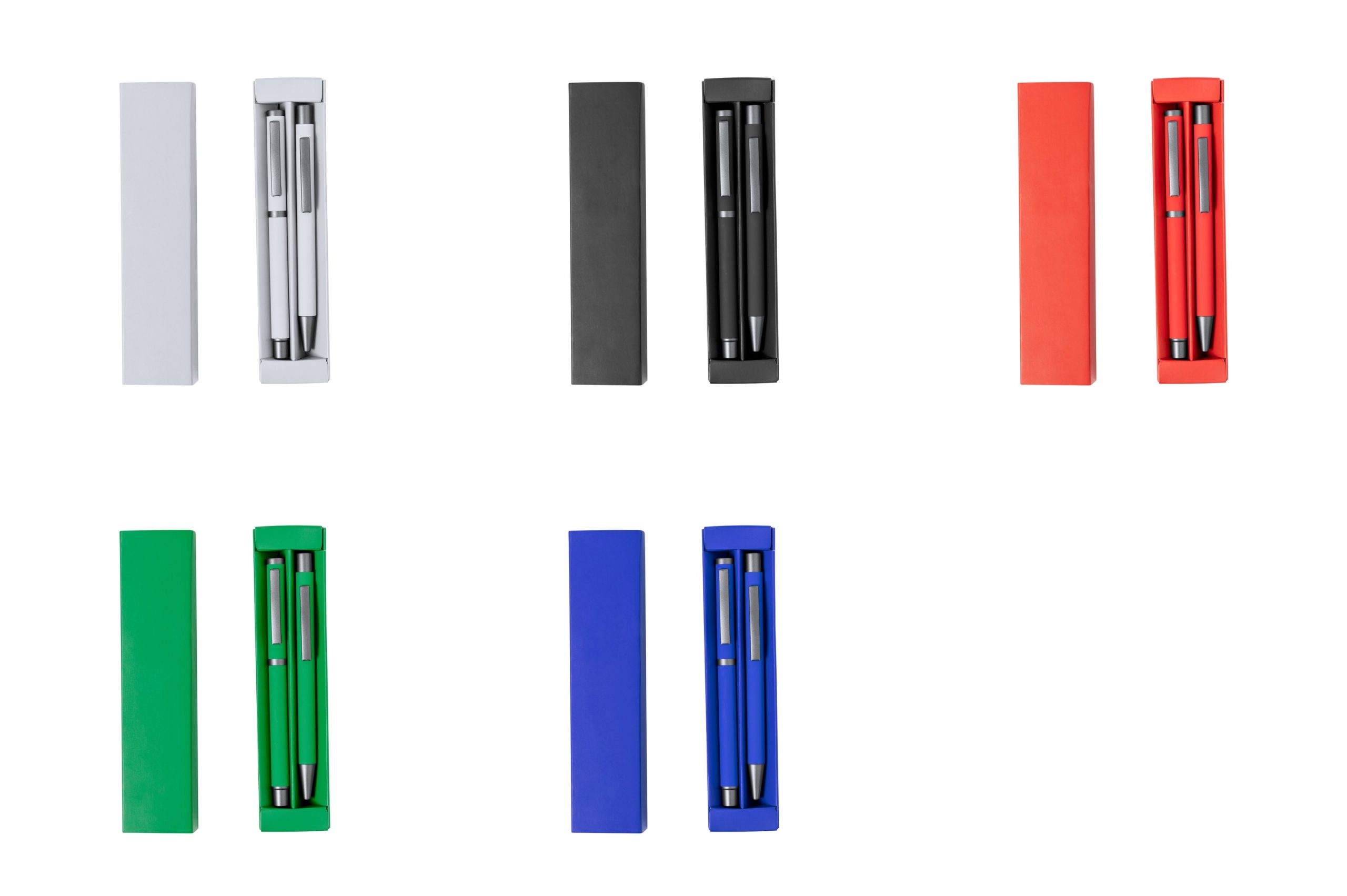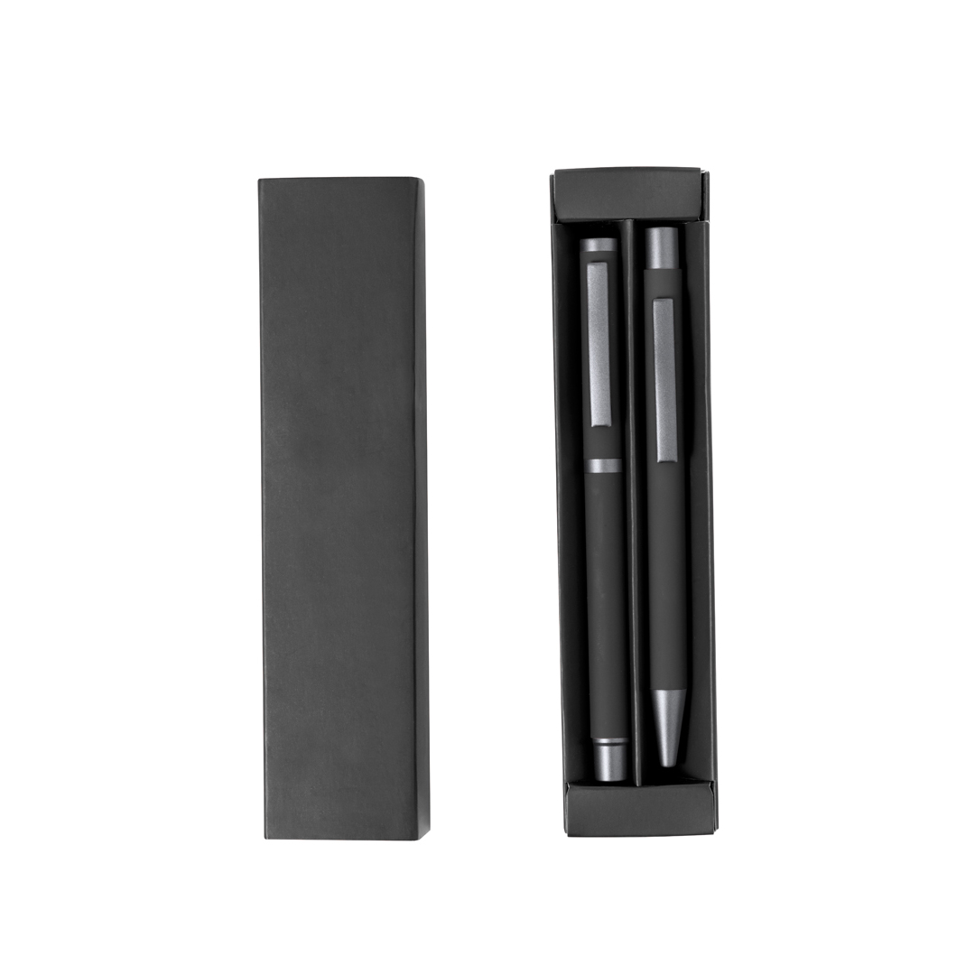 Κομψό σετ στυλό και ρολό στυλό. Στυλό με κουμπιά και στυλό rollerball με καπάκι, και τα δύο με μεταλλικό κλιπ, κασέτα jumbo και μπλε μελάνι. Σε διάφορα μονόχρωμα χρώματα, με λαστιχένιο φινίρισμα και σκούρο γκρι μεταλλικούς τόνους.