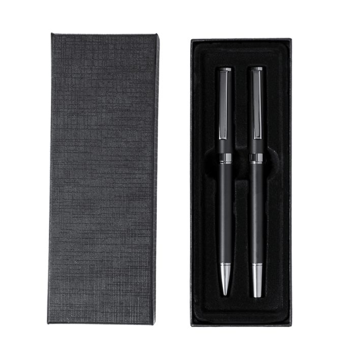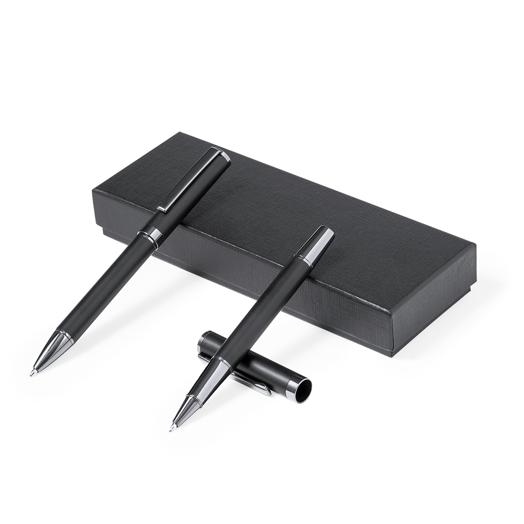 Κομψό σετ στυλό και ρολό στυλό. Στυλό με μηχανισμό περιστροφής και roller με καπάκι, και τα δύο με μεταλλικό κλιπ. Σε κομψό μαύρο ματ φινίρισμα και διακριτικές πινελιές χρωμίου. με μπλε μελάνι και παρουσιάζεται σε μαύρη κραφτ θήκη, με βελούδινη αφή σε κομμένο εσωτερικό.