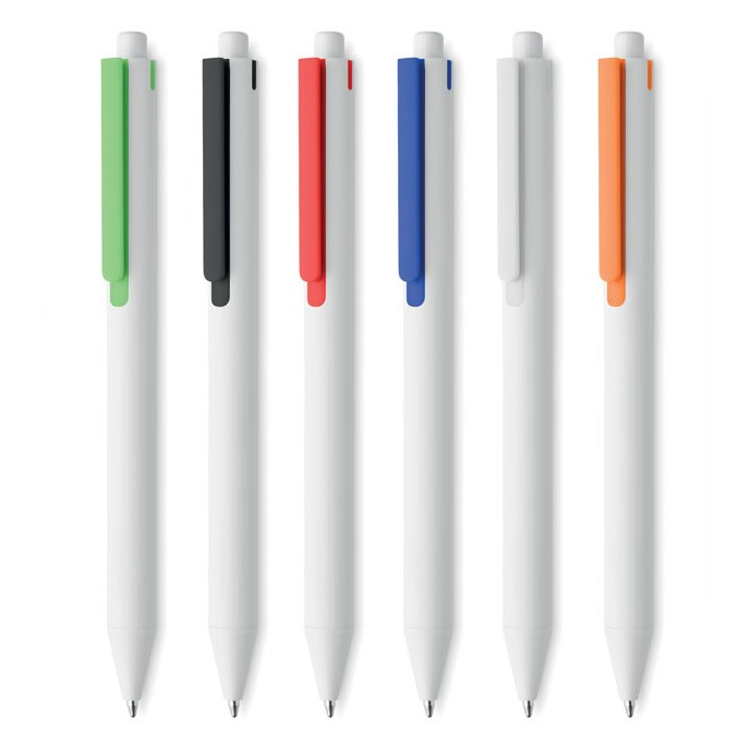 Πλαστικό στυλό με άσπρο σώμα και χρωματιστά clips .