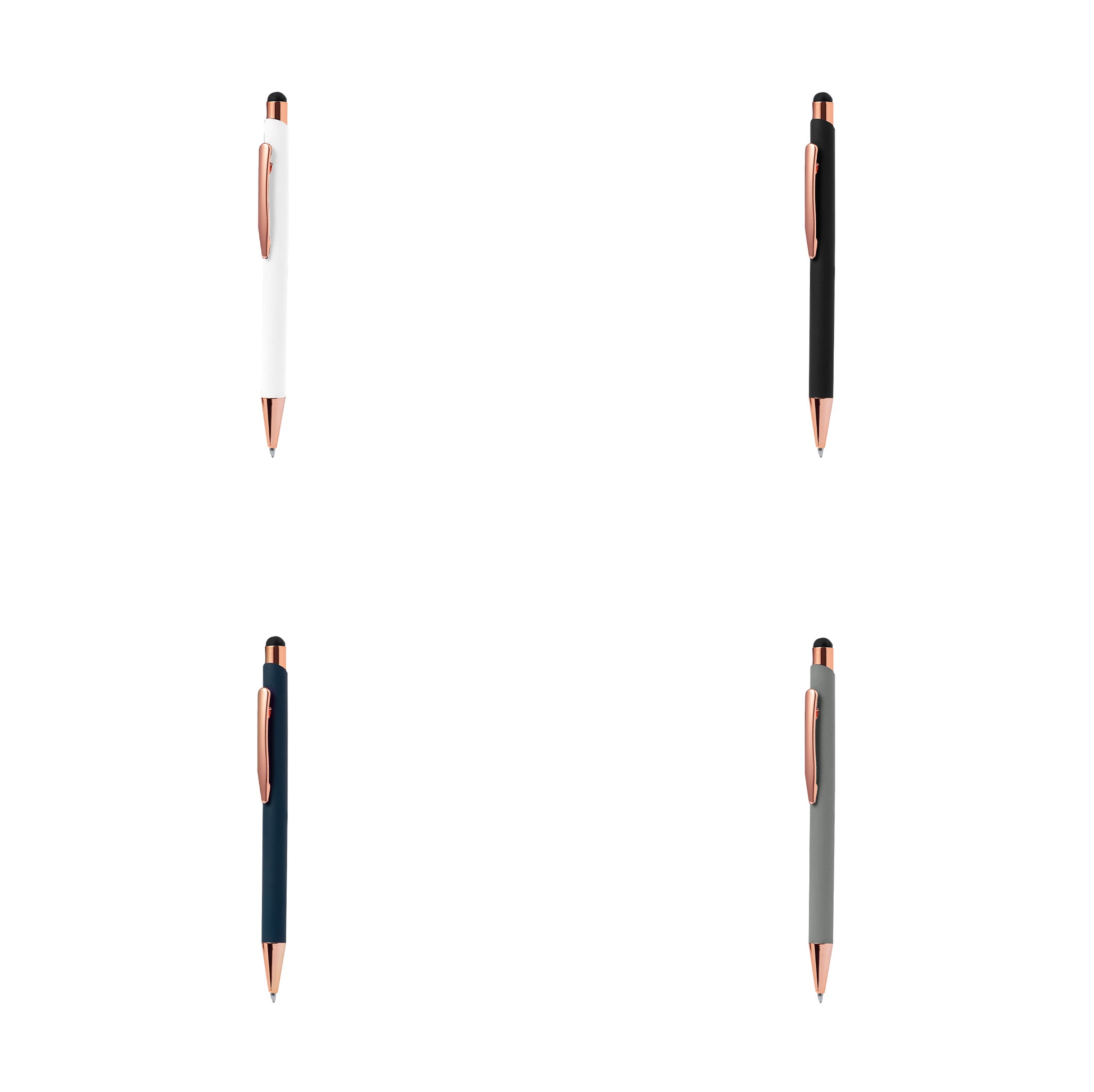 Στυλό αφής από καουτσούκ ειδικά σχεδιασμένο για σήμανση με λέιζερ με ροζ λογότυπο.