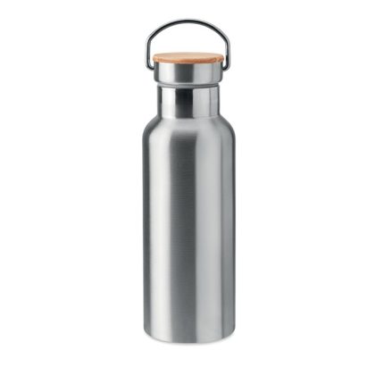 Μεταλλικό θερμός διπλού τοιχώματος από ανοξείδωτο χάλυβα με καπάκι από μπαμπού και λαβή μεταφοράς. Χωρητικότητα: 500 ml.