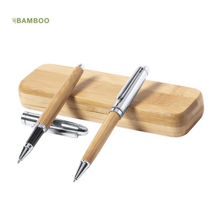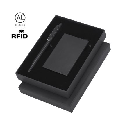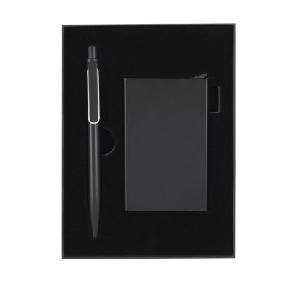 Ξεχωριστό σετ στυλό και roller στυλό, σχεδιασμένα και τα δύο με κομψά μαύρα σώματα αλουμινίου και ροζ χρυσά διακοσμητικά στοιχεία.
